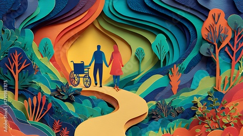 illustration, artwork, abstract, colourful, vibrant, scenic, landscape, nature, tree, path, couple, man, woman, wheelchair, accessibility, inclusion, disability, support, walking, journey, togetherness, love, care, orange, blue, green, red, creative, design, artistic, depth, texture, intricate, detailed, acceptance, compassion, empathy
