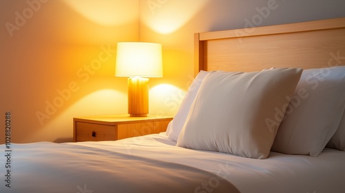 A cozy bedroom featuring soft white and beige bedding, wooden nightstands, and soft lighting that creates a warm, inviting atmosphere.