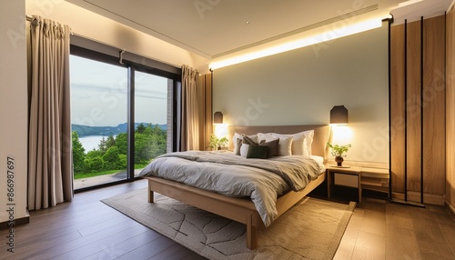 A cozy bedroom with a king-size bed, soft lighting, and a large window with a view