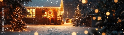A cozy cabin adorned with festive lights, surrounded by snow-covered trees and falling snowflakes, evoking holiday warmth and joy.