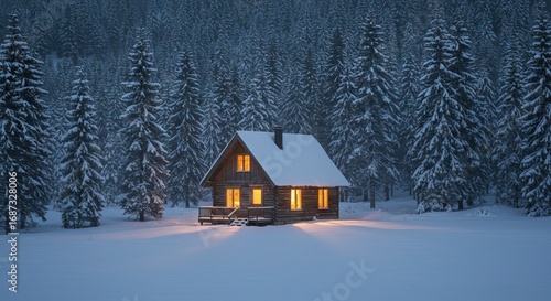 A cozy cabin in a snowladen forest illuminated by warm light