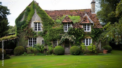 A cozy cottage nestled in a picturesque countryside, adorned with ivy-covered walls and rustic charm