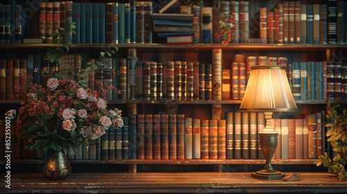 A cozy, dimly lit library shelf filled with old books, a vase of flowers, and a vintage lamp casting a warm glow over a wooden tabletop.