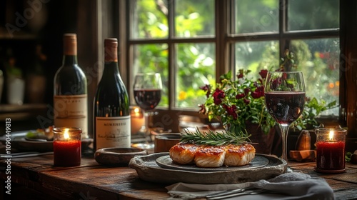 A cozy dining setting featuring wine bottles, glasses, candles, and a beautifully arranged dish, all bathed in warm, natural light.