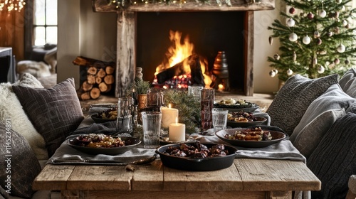 dinner, table, food, fireplace, candle, festive, cosy, gathering, decor, warmth, family, celebration, holiday, dish, drink, plate, atmosphere, comfort, texture, greenery, log, cushion, light, colours, setting, joy, togetherness, winter, snack, sweet, ambience, hospitality, home, tradition, feast, party, evening, scene, arrangement, rustic, inviting, seasonal, favor, enjoyment, friends, relax, taste, meal, company