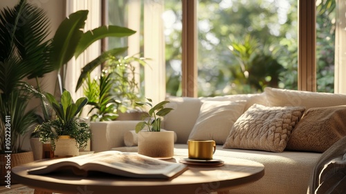 A cozy living room flooded with natural light, featuring a comfortable white sofa, green plants, and a warm wooden coffee table inviting relaxation.