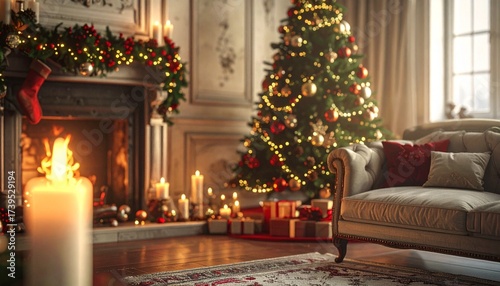A cozy living room with glowing fireplace and decorated Christmas tree, festive holiday atmosphere