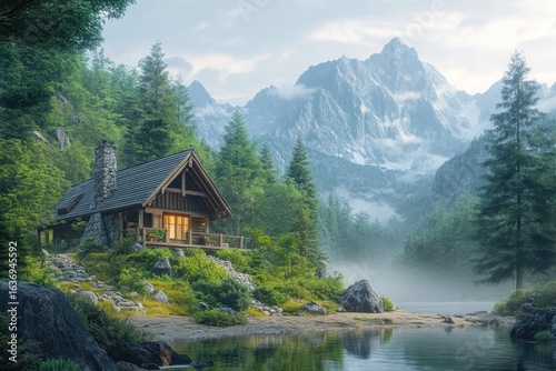 A cozy log cabin nestled beside a serene lake with majestic mountains in the backdrop, bathed in soft, misty light.