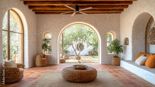 A cozy Mediterranean-style home interior featuring terracotta floor tiles, white stucco walls, and large arched windows that maximize natural light