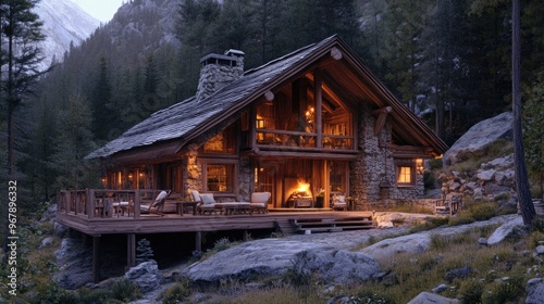 A cozy mountain cabin with a wraparound porch, wooden interiors, and a roaring fireplace, offering a warm retreat in the heart of nature.