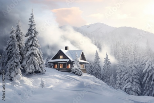 A cozy mountain hut hidden amidst a snow-covered forest.
