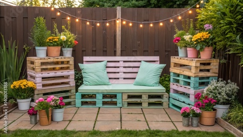 wooden, decoration, garden, seating, pallet, flower, decor, landscaping, calmness, aesthetic, greenery, furniture, invite, vibrant, light, relaxation, comfort, plant, cosy, ambience, charme, rustic, cushion, backyard, home, terrace, arrangement, pot, space, bricolage, leisure, cheerful, style, design, creative, colourful, beauty, nature, environment, spring, summer, view