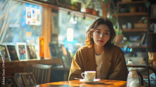 cafes, korean, model, trendy, seoul, enjoying, hot drink, warm, lighting, stylish, furniture, relaxed, ambience, honed, scene, fisheye, lens, soft, morning, light, ar, style, raw, urban, lifestyle, fashion, culture, portrait, detailed, photo, shoot, comfortable, vibrant, setting