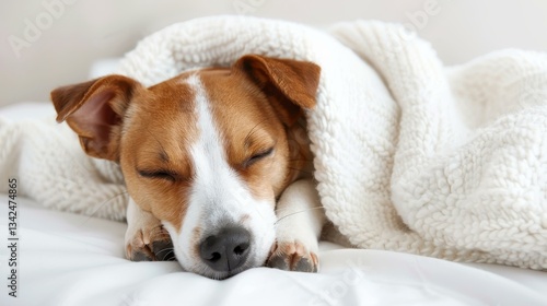 A cozy puppy snoozes in a blanket, its dreams full of joy, nestled comfortably in a warm and safe space.