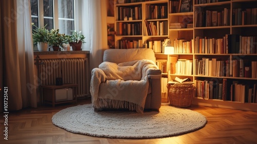 A cozy reading nook with a light oak parquet floor, soft lighting, and a comfortable armchair.