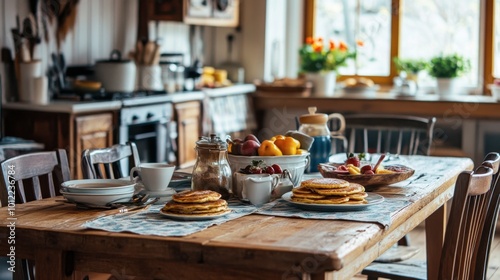 A cozy, rustic farmhouse table, set for a family breakfast with pancakes, fruit, and coffee.