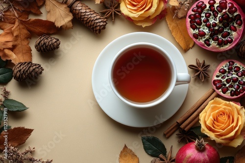 A cozy scene with a cup of tea surrounded by autumn leaves and flowers