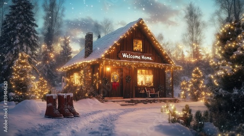 cabin, snow, light, welcome, home, winter, tree, cosy, festive, holiday, nature, warmth, decoration, scene, rustic, peaceful, evening, atmosphere, charme, serenity, landscape, seasonal, beauty, calmness, architecture, fireplace, chaplet, boot, path, garden, pine, glow, celebration, joy, comfort, family, gathering, nostalgia, view, retreat, snowflake, ambience, wood, roof, entrance, spirit, cheer, community
