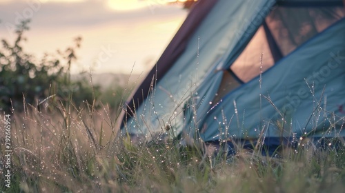 A cozy tent pitched in a dewcovered field promising a restorative and invigorating nights sleep under the starry skies. 2d flat cartoon.