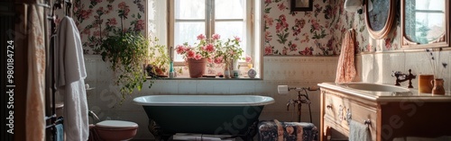 bathroom, vintage, flower, sunlight, tub, decor, home, relaxation, interior, design, plant, cosy, wallpaper, natural, light, furnishing, mirror, towel, basin, wood, elegance, comfort, calmness, style, ambience, warmth, aesthetic, ceramic, greenery, atmosphere, rustic, hygiene, cleaning, retreat, charme, space, inviting, serene, peaceful, floral, accessory, arrangement, window, view, heritage, nostalgia