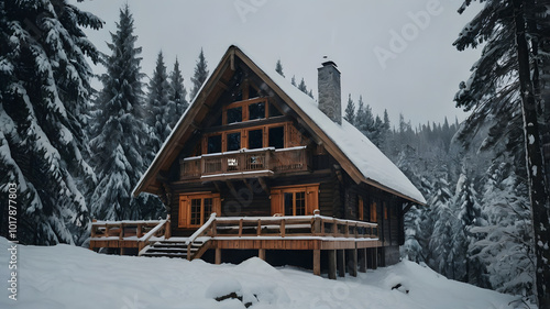 A cozy winter chalet nestled in a snowy forest, surrounded by snow-laden trees, creating a serene and picturesque winter wonderland