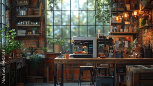 workspace, hot drink, machine, plant, table, light, window, decor, tool, utensil, shelf, jar, book, colours, ambience, cosy, modern, design, nature, creativity, organisation, warmth, brick, wood, home, equipment, productivity, atmosphere, interior, aesthetic, relaxation, beverage, brewing, technology, art, inspiration, environment, structure, lighting, material, comfort, style, harmony, arrangement