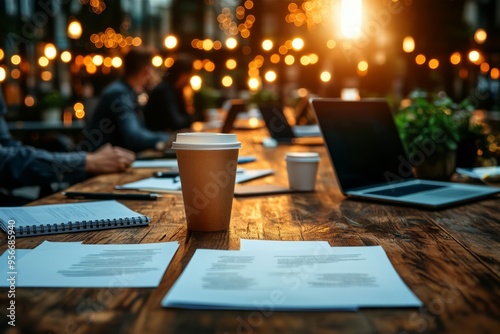A cozy workspace featuring coffee, documents, and laptops, illuminated by soft lighting from the sunset, perfect for inspiration.