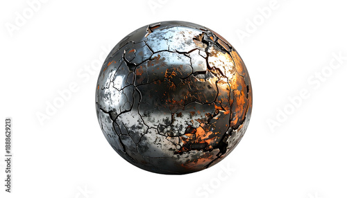 sphere, cracked, metallic, reflective, silver, orange, black, background, damaged, broken, destruction, grunge, texture, surface, abstract, isolated, three-dimensional, render, digital, art, design, element, orb, ball, globe, corrosion, rusted, aged, weathered, rough, industrial, pattern, detail, geometry, structure, concept, creative, modern, composition, light, shadow, contrast, material, earth, earth, future, science, fiction