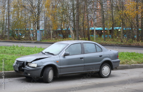 A crashed dark gray car is parked on the road, Solidarity Avenue, St. Petersburg, Russia, November 08, 2024
