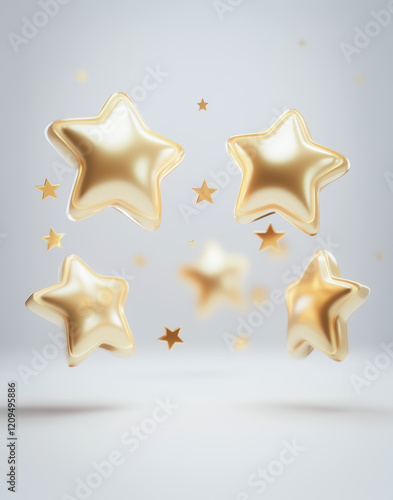 A creative rendering of golden stars in 3D-style floating within transparent speech bubbles, designed with a minimalist aesthetic.