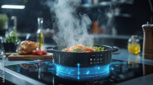 creative, shot, smart, kitchen, appliance, making, epicure, meal, detailed, control, visible, culinary, scene, sleek, style, photo, illustrating, role, advanced, technology, cooking, life events, high, quality, image, innovation, elegance, modern