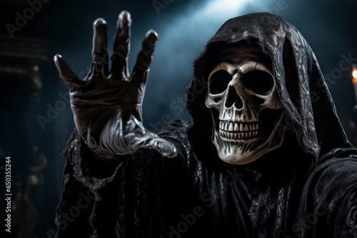 A Creepy halloween grim reaper holding out his hand on a scary dark background