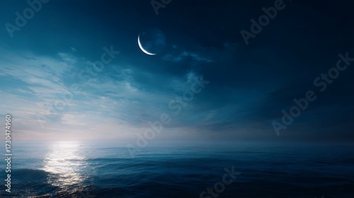 crescent, moon, twilight, sky, ocean, calm, sea, water, night, horizon, light, dark, blue, serene, tranquil, peaceful, huge, expanse, nature, landscape, evening, cloudy, atmosphere, celestial, cosmic, lunar, deep, endless, surface, wave, ripple, shimmer, glow, aethereal, mystic, atmospheric, distant, moody, quiet, solitude, travel, journey, dreaming, hopeful, soft, subtile, dreamlike, mystery