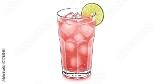 beverage, drink, cocktail, refreshing, pink, ice, lime, garnish, glasses, cold, tropical, summer, illustration, digital artwork, photorealistic, crisp, clean, white background, isolated, still life, fruit, citrous, sweet, sour, sparkling, fizzy, water droplets, condensation, transparent, clear, cube, square, geometric, minimalist, modern, artwork, vibrant, closeup, single object, refreshment, thirst quenching, delicious, tasty, alcoholic, nonalcoholic, lime slice