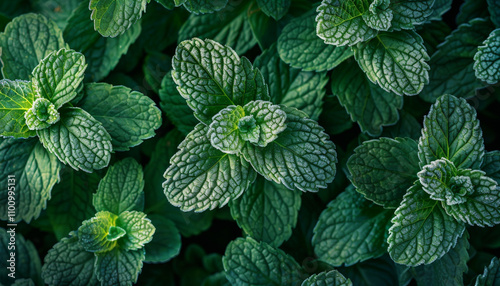 A crisp top view of mint leaves with a light layer of autumn frost, captured in the early morning. The frost highlights the delicate details of the leaves beautifully.