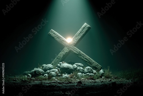 A cross illuminated by light in a dark, mysterious environment.