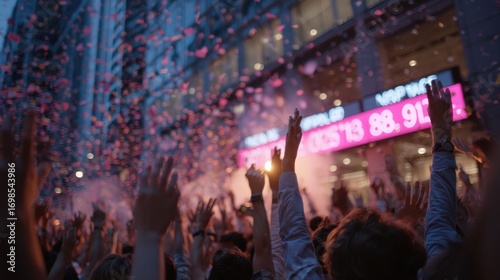 celebration, confetti, city, twilight, crowd, party, city lights, night sky, gathering, people, night, building, joy, event, together, nightlife, fun, excitement, festival, joyful, happiness, lively, animated, throng, massa, urban, metropolis, community