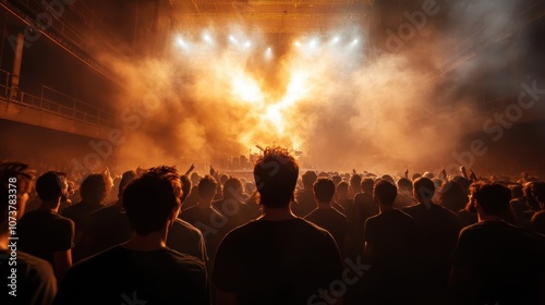 A crowd of concertgoers immersed in a spectacular live music show, gazing towards an awe-inspiring light display with smoke and vibrant atmospheres creating excitement.
