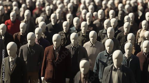 faceless, mannequin, crowd, uniformity, anonymous, surreal, identity, massa, group, clothing, attire, expressionless, fashion, sameness, artificial, people, generic, society, urban