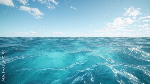A crystal-clear ocean with turquoise waters, gentle waves, and a distant horizon, providing a refreshing and tropical backdrop for beach or vacation-related visuals
