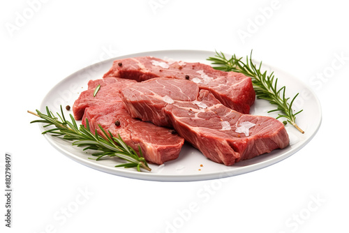 A Culinary Canvas: Raw Meat and Rosemary on a White Plate on White or PNG Transparent Background.