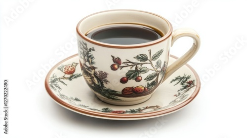 hot drink, cup, saucer, bird, berry, leaf, nature, design, ceramic, creamy, relaxation, serene, cosy, warm colors, hot drink, beverage, tableware, still life, closeup, isolated, white background, elegant, calm