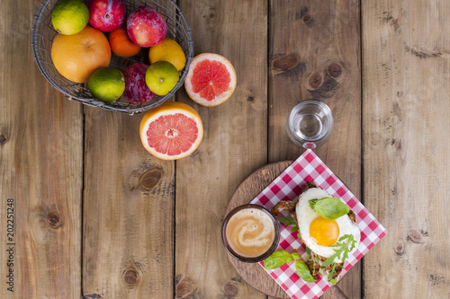 A cup of fragrant coffee and a glass of water. Toast with egg and salad and fruit for breakfast. Tasty and healthy food. Diet and vitamins. Good morning. Wooden background. View from above. Text