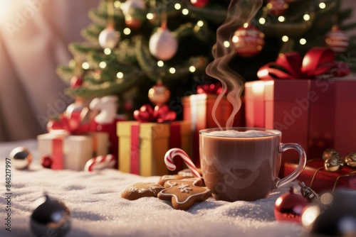A cup of hot chocolate with a gingerbread cookie and christmas tree, AI