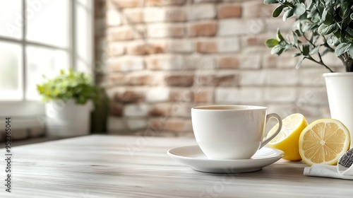A cup of tea with lemon and a teapot on a white table Kitchen with wooden empty countertop and brick wall in the background Interior in modern Scandinavian style Breakfast concept : Generative AI
