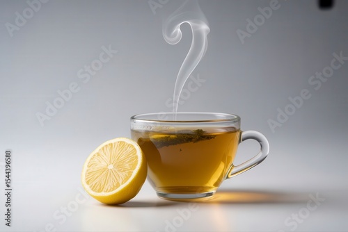 tea, lemon, cup, drink, beverage, steam, hot, glasses, yellow, white, fruit, citrous, refreshment, liquid, aroma, healthy, warm, mug, slice, fresh, table, background, closeup, still, life, transparent, herb, tonic, make well, infusion, decoction, potion, elixir, brew, zest, lemony, clear, with, rising, surface, light, coloured, art