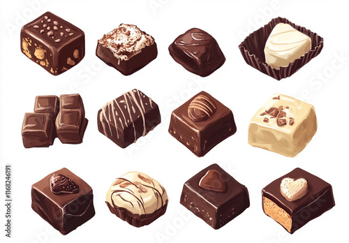 A curated selection of assorted chocolates displayed against a bright white background. The clean composition emphasizes their appealing shapes and decadent allure.