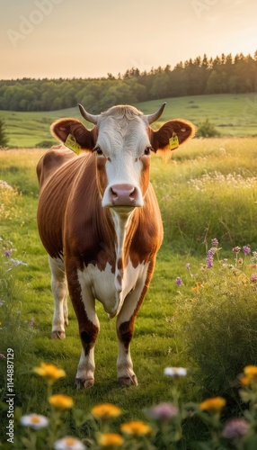 A curious cow standing in a vibrant meadow filled with wildflowers, bathed in the warm golden light of sunset, with rolling green hills in the background