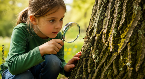 A curious young girl intently examines an insect on a tree trunk with a magnifying glass, lost in a moment of discovery and childhood wonder.