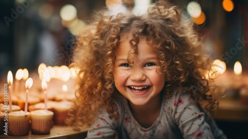 A curly-haired girl laughing joyfully with a background of lit candles, capturing happiness and a warm, festive atmosphere.